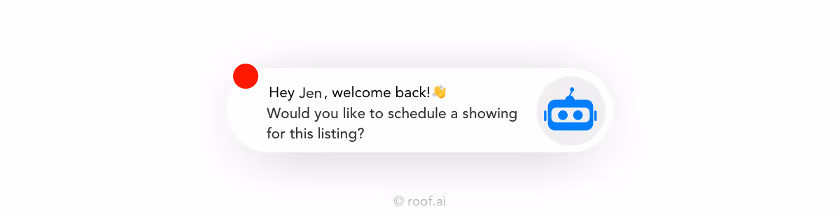 Roof has released AI-driven property alerts. We also want to export the personalized experience off of the website. Visitors that have searched for properties with Roof will receive listing alerts based on their buying preferences and website search activity. Whenever a customer clicks on the email link to check out the property on your website, the bot will recognize them, greet them personally, and ask them to schedule a visit.