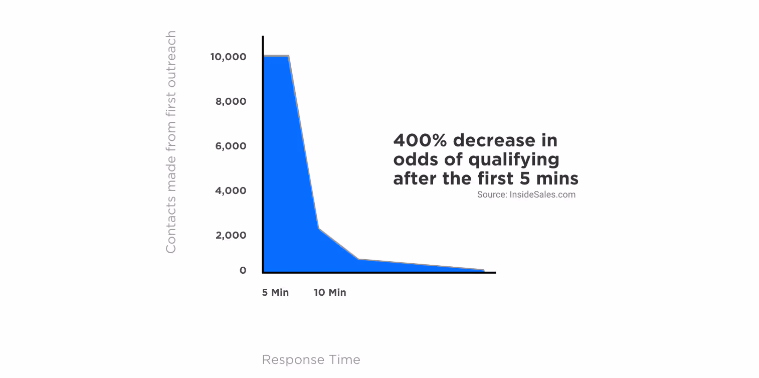 Why response time? Because in a HBR study of over 2,000 companies, researchers discovered that if companies don’t respond to a lead in less than five minutes, their chance of converting that lead decreases by 400%!