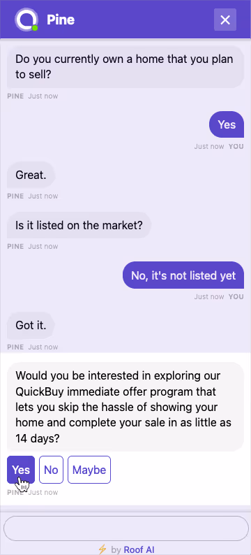 When a customer mentions that they have a property for sale – and if your company offers the QuickBuy program – your bot can ask the customer if they are interested in receiving a cash offer on their property.