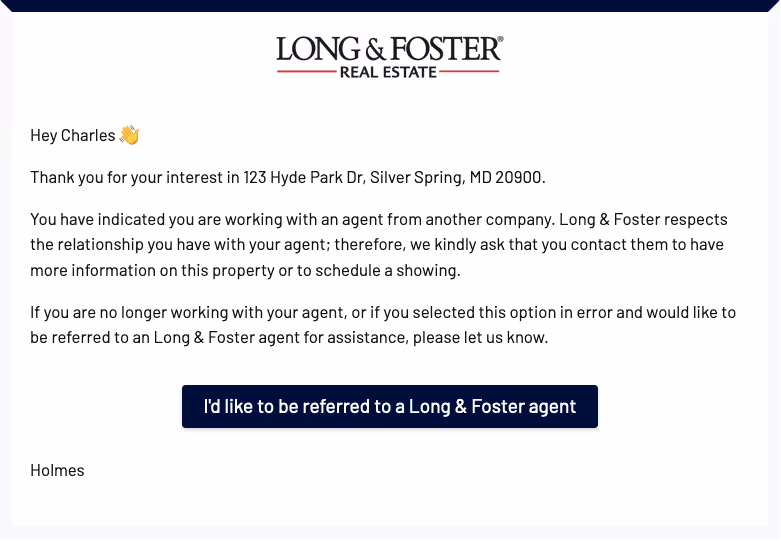 We're aware how sensitive it can be when a customer is working with a competitor agent. That's why we make sure to qualify each lead by asking if they're working with one. We now have the ability to add extra lead routing and qualification capabilities in that specific use case. Here's an example when a competitor customer inquiries on an IDX listing: