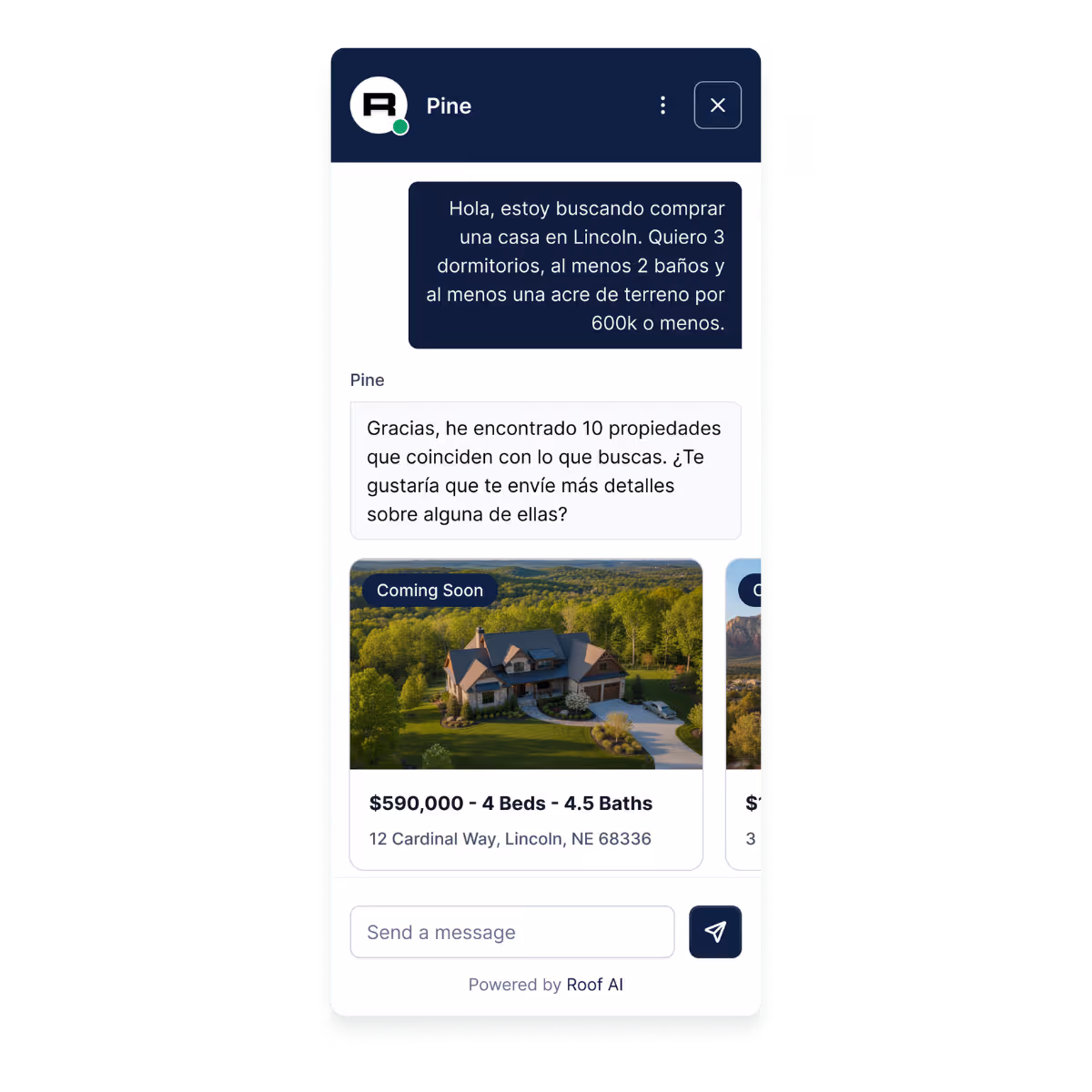 In 2016, Roof AI built the industry's first real estate chatbot. Like magic, it worked – and kept working. That's because we saw what others didn't: homebuyers didn't want filters or dropdowns. They wanted to ask questions in their own words, like "Show me homes with big backyards near good schools."