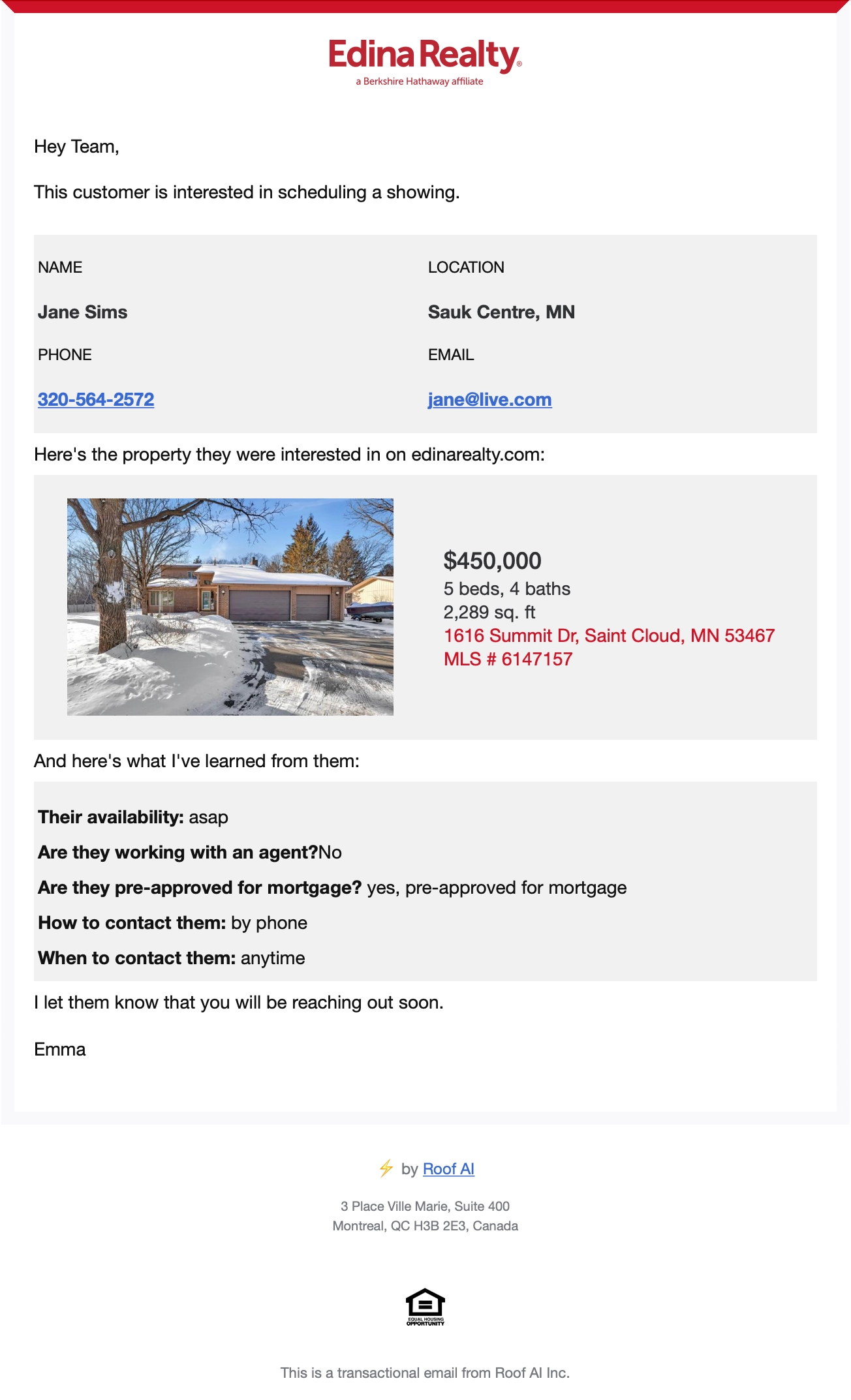 This email will include details including the listing the user is interested in, whether they’ve been pre-approved in the past 6 months, their down-payment plan, and their credit score status.