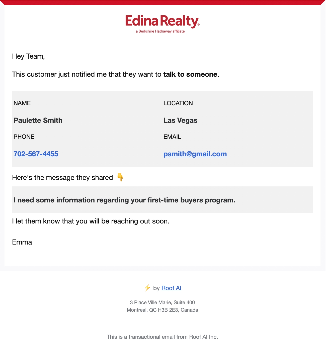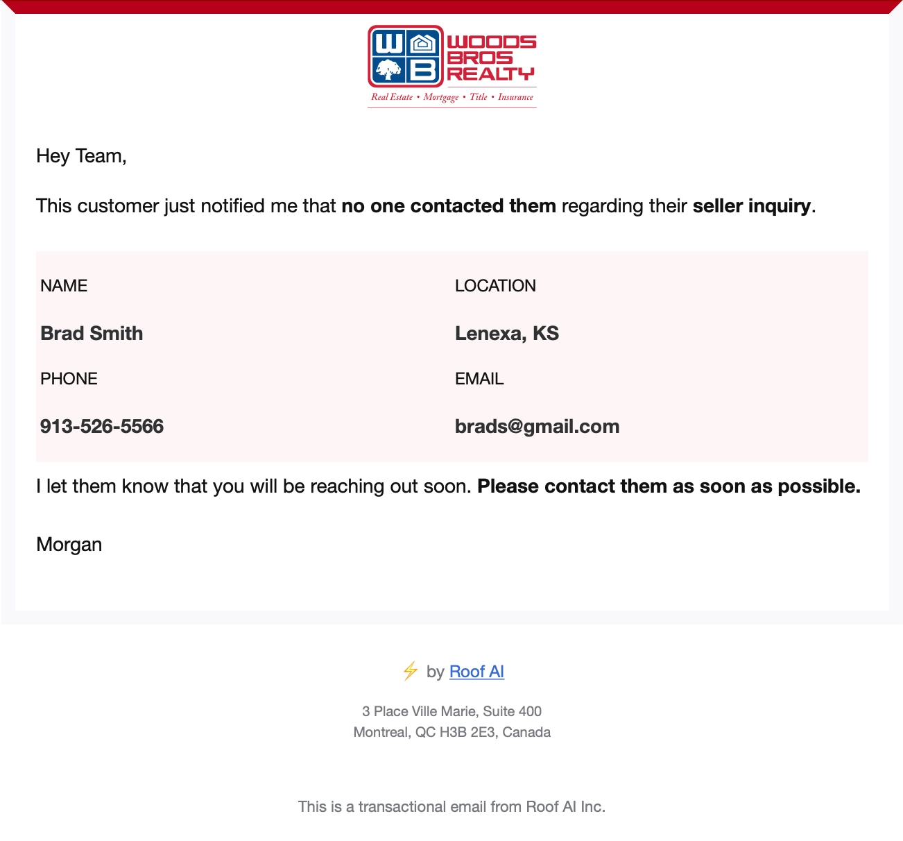 Your Roof AI assistant will follow up with users who submitted inquiries, asking them whether someone has gotten in contact with them or not. In the case that a user hasn't been contacted, an escalation email will be sent to the team notifying them that they need to reach out to them.